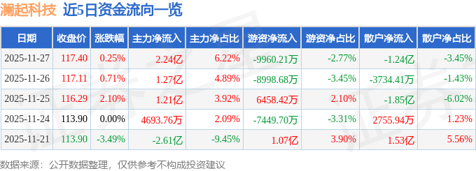 证券之星消息,截至2025年11月27日收盘,澜起科技(688008)报收于117.4元,上涨0.25%,换手率2.63%,成交量30.07万手,成交额36.01亿元。