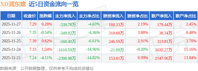 证券之星消息,截至2025年11月27日收盘,XD浦东建(600284)报收于7.29元,上涨0.28%,换手率1.03%,成交量10.02万手,成交额7337.41万元。
