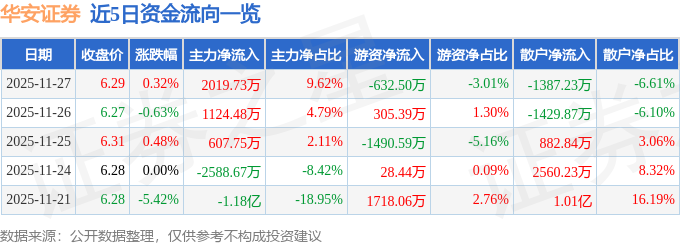 证券之星消息,截至2025年11月27日收盘,华安证券(600909)报收于6.29元,上涨0.32%,换手率0.71%,成交量33.19万手,成交额2.1亿元。