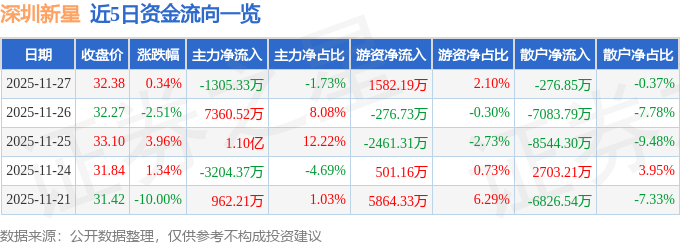 证券之星消息,截至2025年11月27日收盘,深圳新星(603978)报收于32.38元,上涨0.34%,换手率10.88%,成交量22.96万手,成交额7.55亿元。