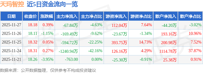 证券之星消息,截至2025年11月27日收盘,天玛智控(688570)报收于18.18元,上涨0.39%,换手率0.43%,成交量8047.0手,成交额1465.77万元。