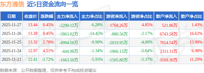 证券之星消息,截至2025年11月27日收盘,东方通信(600776)报收于13.44元,上涨0.45%,换手率2.83%,成交量27.08万手,成交额3.65亿元。