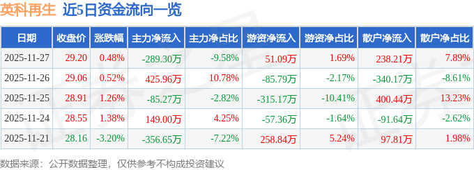 11月27日的资金流向数据方面,主力资金净流出289.3万元,占总成交额9.58%,游资资金净流入51.09万元,占总成交额1.69%,散户资金净流入238.21万元,占总成交额7.89%。