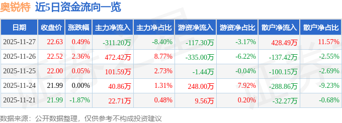 证券之星消息,截至2025年11月27日收盘,奥锐特(605116)报收于22.63元,上涨0.49%,换手率0.4%,成交量1.64万手,成交额3703.7万元。