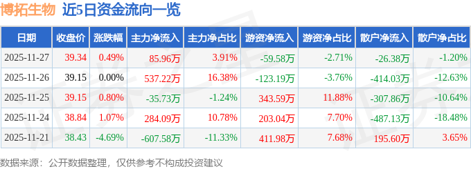证券之星消息,截至2025年11月27日收盘,博拓生物(688767)报收于39.34元,上涨0.49%,换手率0.37%,成交量5549.0手,成交额2197.19万元。