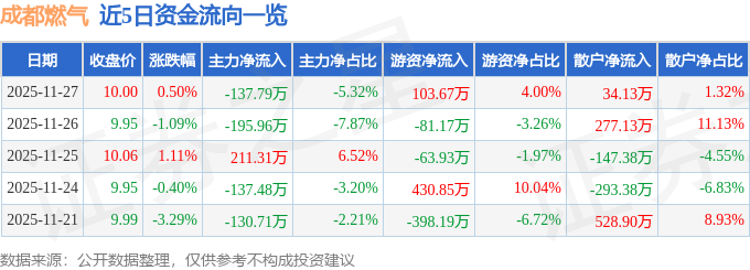 证券之星消息,截至2025年11月27日收盘,成都燃气(603053)报收于10.0元,上涨0.5%,换手率0.29%,成交量2.59万手,成交额2590.64万元。