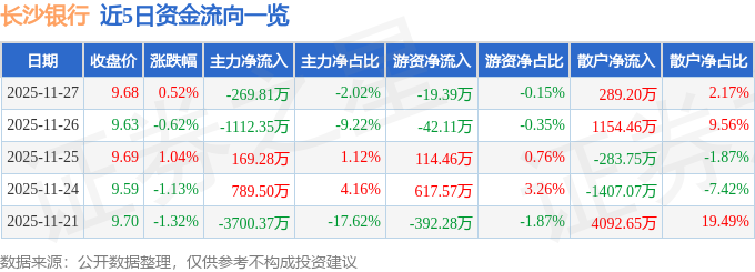 证券之星消息,截至2025年11月27日收盘,长沙银行(601577)报收于9.68元,上涨0.52%,换手率0.34%,成交量13.79万手,成交额1.33亿元。