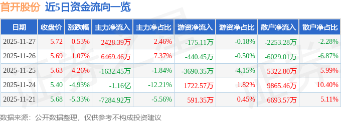 证券之星消息,截至2025年11月27日收盘,首开股份(600376)报收于5.72元,上涨0.53%,换手率6.68%,成交量172.22万手,成交额9.89亿元。