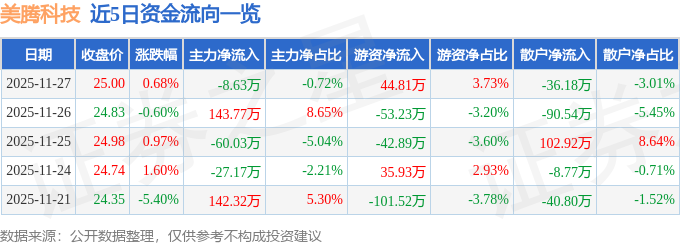 证券之星消息,截至2025年11月27日收盘,美腾科技(688420)报收于25.0元,上涨0.68%,换手率1.41%,成交量4810.0手,成交额1200.43万元。