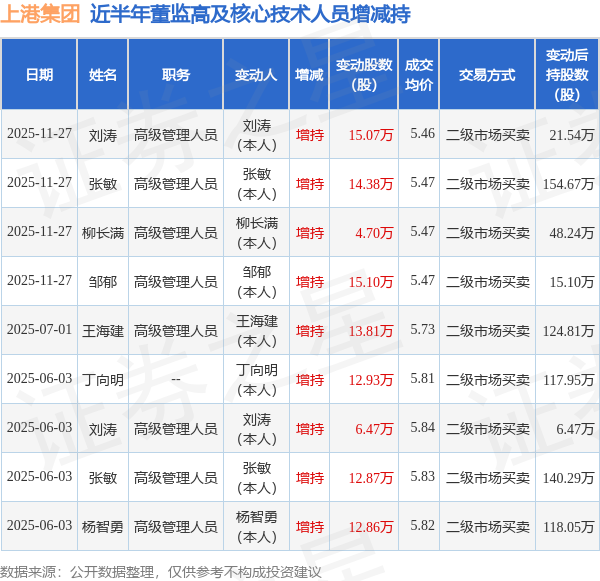上港集团近半年内的董监高及核心技术人员增减持详情如下: