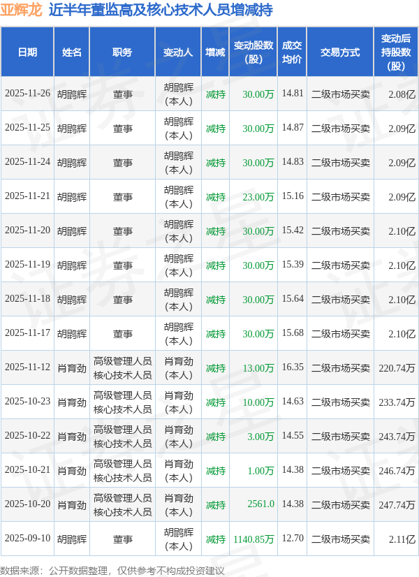 亚辉龙近半年内的董监高及核心技术人员增减持详情如下: