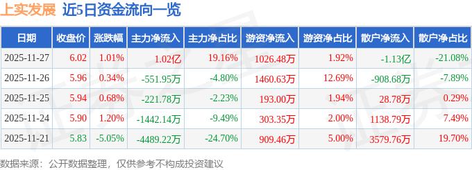证券之星消息,截至2025年11月27日收盘,上实发展(600748)报收于6.02元,上涨1.01%,换手率4.61%,成交量85.01万手,成交额5.34亿元。