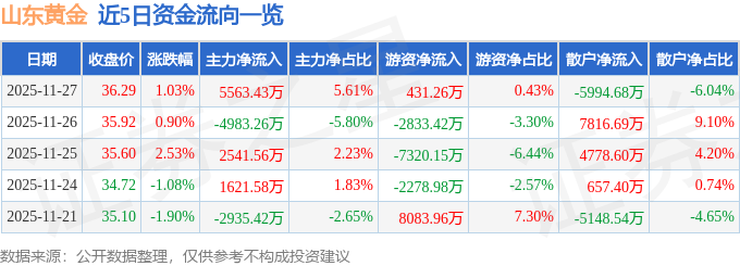 证券之星消息,截至2025年11月27日收盘,山东黄金(600547)报收于36.29元,上涨1.03%,换手率0.76%,成交量27.4万手,成交额9.92亿元。