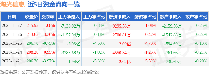 证券之星消息,截至2025年11月27日收盘,海光信息(688041)报收于215.95元,上涨1.08%,换手率1.65%,成交量38.38万手,成交额85.83亿元。