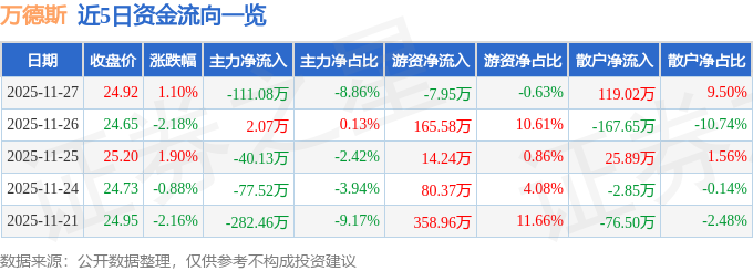 证券之星消息,截至2025年11月27日收盘,万德斯(688178)报收于24.92元,上涨1.1%,换手率0.59%,成交量5022.0手,成交额1253.19万元。
