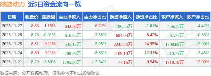 证券之星消息,截至2025年11月27日收盘,陕鼓动力(601369)报收于8.83元,上涨1.15%,换手率0.69%,成交量11.7万手,成交额1.03亿元。