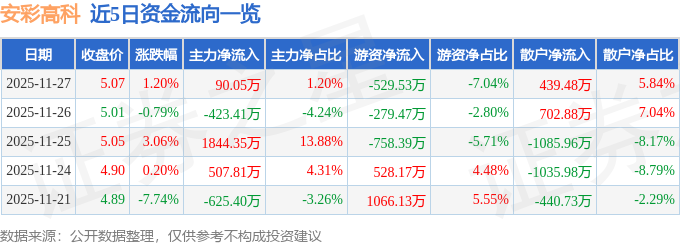 证券之星消息,截至2025年11月27日收盘,安彩高科(600207)报收于5.07元,上涨1.2%,换手率1.36%,成交量14.82万手,成交额7525.33万元。
