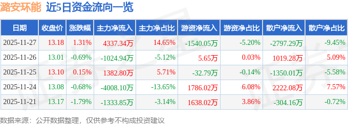 证券之星消息,截至2025年11月27日收盘,潞安环能(601699)报收于13.18元,上涨1.31%,换手率0.75%,成交量22.53万手,成交额2.96亿元。