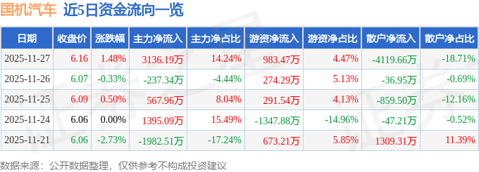 证券之星消息,截至2025年11月27日收盘,国机汽车(600335)报收于6.16元,上涨1.48%,换手率2.36%,成交量35.3万手,成交额2.2亿元。