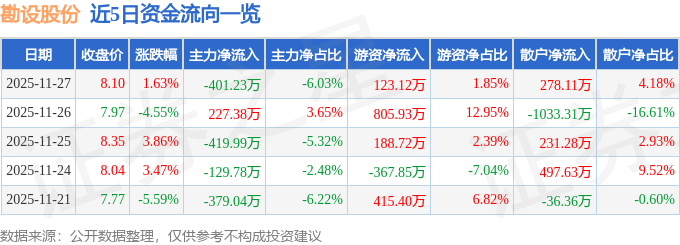 证券之星消息,截至2025年11月27日收盘,勘设股份(603458)报收于8.1元,上涨1.63%,换手率2.67%,成交量8.16万手,成交额6658.38万元。