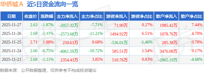 证券之星消息,截至2025年11月27日收盘,华侨城A(000069)报收于2.63元,下跌1.87%,换手率1.47%,成交量101.24万手,成交额2.67亿元。