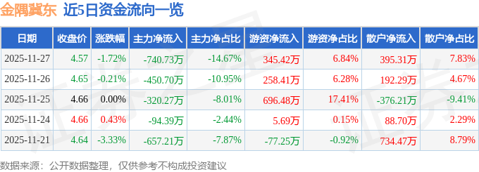 11月27日的资金流向数据方面,主力资金净流出740.73万元,占总成交额14.67%,游资资金净流入345.42万元,占总成交额6.84%,散户资金净流入395.31万元,占总成交额7.83%。