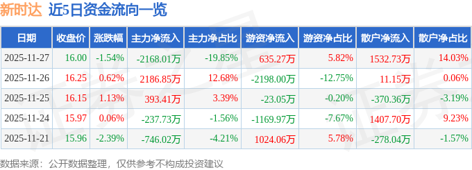 证券之星消息,截至2025年11月27日收盘,新时达(002527)报收于16.0元,下跌1.54%,换手率1.28%,成交量6.77万手,成交额1.09亿元。