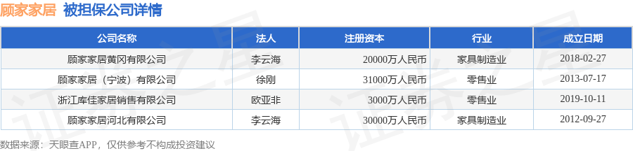 顾家家居11月26日披露4笔对外担保,被担保公司4家。对外担保明细如下表: