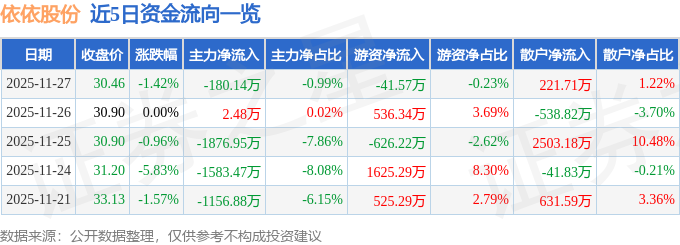 证券之星消息,截至2025年11月27日收盘,依依股份(001206)报收于30.46元,下跌1.42%,换手率5.49%,成交量5.84万手,成交额1.82亿元。