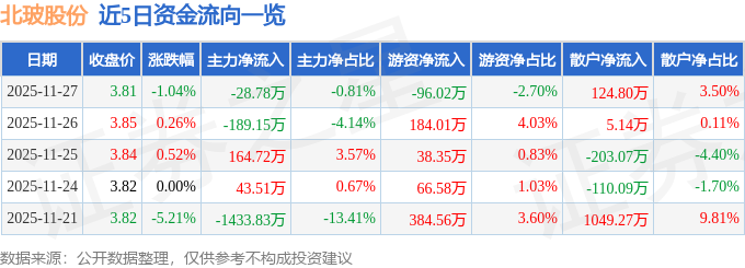 证券之星消息,截至2025年11月27日收盘,北玻股份(002613)报收于3.81元,下跌1.04%,换手率1.2%,成交量9.3万手,成交额3562.13万元。