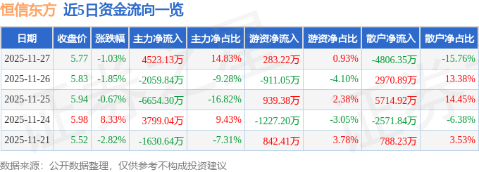 证券之星消息,截至2025年11月27日收盘,恒信东方(300081)报收于5.77元,下跌1.03%,换手率8.65%,成交量52.33万手,成交额3.05亿元。