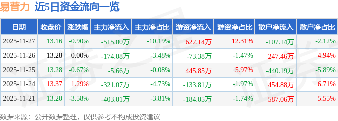 证券之星消息,截至2025年11月27日收盘,易普力(002096)报收于13.16元,下跌0.9%,换手率0.55%,成交量3.82万手,成交额5055.9万元。
