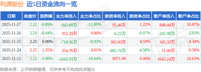 证券之星消息,截至2025年11月27日收盘,利源股份(002501)报收于2.22元,下跌0.89%,换手率0.99%,成交量35.04万手,成交额7804.28万元。