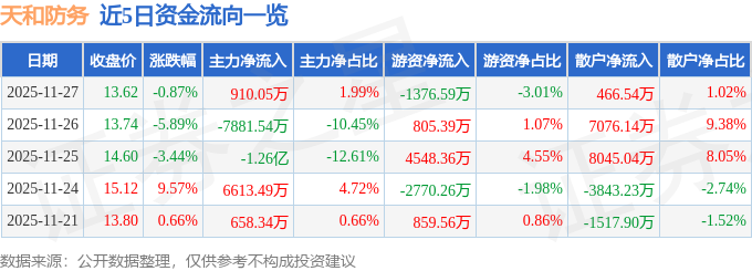 证券之星消息,截至2025年11月27日收盘,天和防务(300397)报收于13.62元,下跌0.87%,换手率8.26%,成交量33.51万手,成交额4.57亿元。