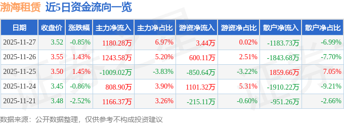 证券之星消息,截至2025年11月27日收盘,渤海租赁(000415)报收于3.52元,下跌0.85%,换手率0.89%,成交量47.96万手,成交额1.69亿元。