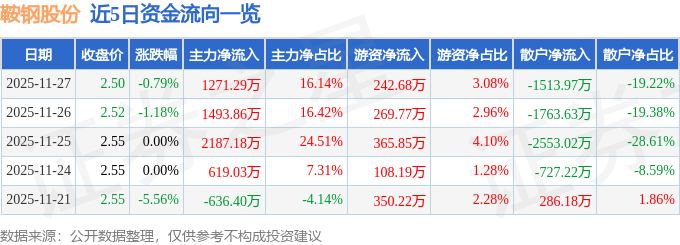 证券之星消息,截至2025年11月27日收盘,鞍钢股份(000898)报收于2.5元,下跌0.79%,换手率0.39%,成交量31.4万手,成交额7876.86万元。