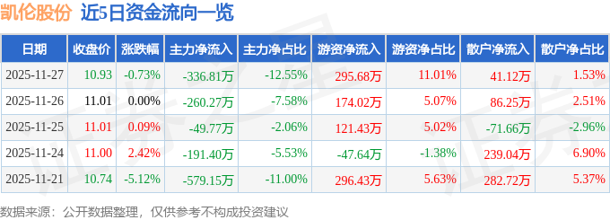 11月27日的资金流向数据方面,主力资金净流出336.81万元,占总成交额12.55%,游资资金净流入295.68万元,占总成交额11.01%,散户资金净流入41.12万元,占总成交额1.53%。