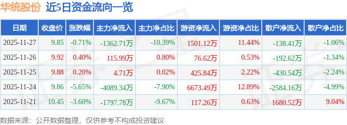 证券之星消息,截至2025年11月27日收盘,华统股份(002840)报收于9.85元,下跌0.71%,换手率1.66%,成交量13.26万手,成交额1.31亿元。