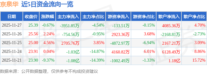 证券之星消息,截至2025年11月27日收盘,京泉华(002885)报收于25.39元,下跌0.67%,换手率14.39%,成交量33.24万手,成交额8.7亿元。