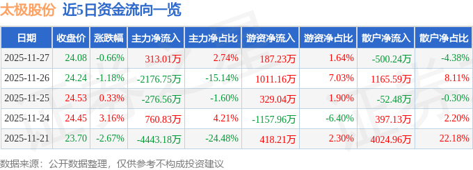 证券之星消息,截至2025年11月27日收盘,太极股份(002368)报收于24.08元,下跌0.66%,换手率0.76%,成交量4.71万手,成交额1.14亿元。