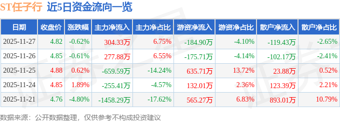 证券之星消息,截至2025年11月27日收盘,ST任子行(300311)报收于4.82元,下跌0.62%,换手率1.73%,成交量9.3万手,成交额4509.77万元。