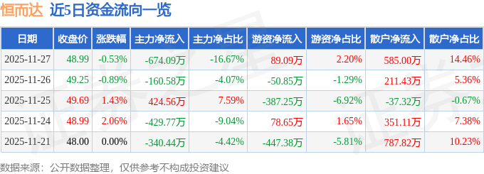 证券之星消息,截至2025年11月27日收盘,恒而达(300946)报收于48.99元,下跌0.53%,换手率1.09%,成交量8228.0手,成交额4044.61万元。
