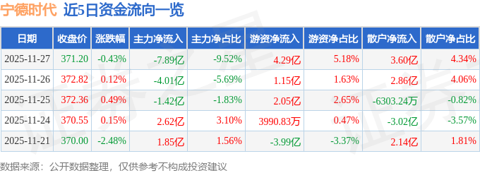 证券之星消息,截至2025年11月27日收盘,宁德时代(300750)报收于371.2元,下跌0.43%,换手率0.52%,成交量22.2万手,成交额82.89亿元。
