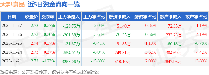 证券之星消息,截至2025年11月27日收盘,天邦食品(002124)报收于2.72元,下跌0.37%,换手率1.14%,成交量22.39万手,成交额6099.22万元。