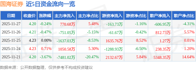 证券之星消息,截至2025年11月27日收盘,国海证券(000750)报收于4.2元,下跌0.24%,换手率0.57%,成交量33.3万手,成交额1.41亿元。