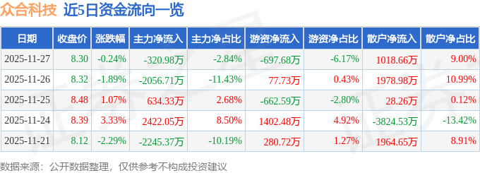 11月27日的资金流向数据方面,主力资金净流出320.98万元,占总成交额2.84%,游资资金净流出697.68万元,占总成交额6.17%,散户资金净流入1018.66万元,占总成交额9.0%。