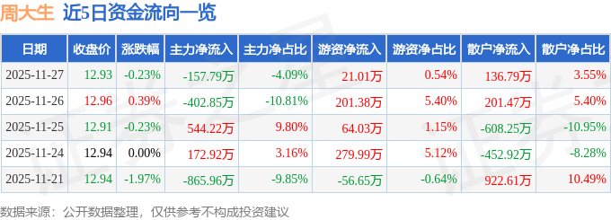 证券之星消息,截至2025年11月27日收盘,周大生(002867)报收于12.93元,下跌0.23%,换手率0.28%,成交量2.98万手,成交额3855.18万元。