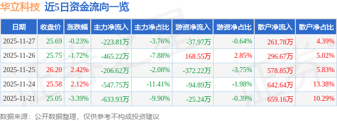 证券之星消息,截至2025年11月27日收盘,华立科技(301011)报收于25.69元,下跌0.23%,换手率1.64%,成交量2.3万手,成交额5957.13万元。