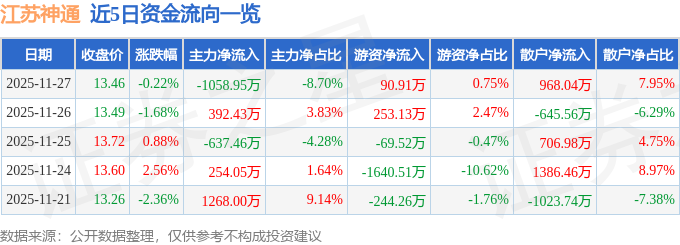 证券之星消息,截至2025年11月27日收盘,江苏神通(002438)报收于13.46元,下跌0.22%,换手率1.92%,成交量8.99万手,成交额1.22亿元。