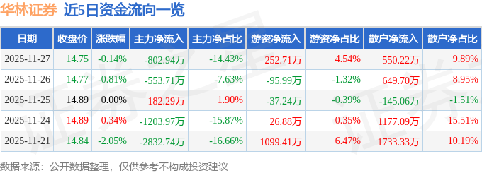 证券之星消息,截至2025年11月27日收盘,华林证券(002945)报收于14.75元,下跌0.14%,换手率0.14%,成交量3.76万手,成交额5562.96万元。